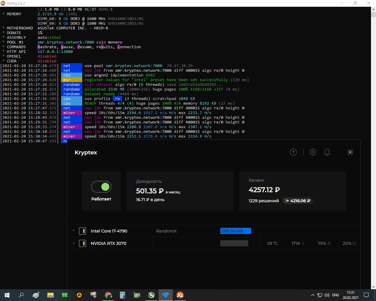 На ферме эфириум копает, а на компьютере переключился с эфира на кав-пов с 18:00 часов по Новосибирскому времени, по Московскому это после 14:00 и всё вроде окей, правда с 13000 BTC снизился до 11500 BTC, хешрейт 22-25! На 22 180W , на 25 уже больше 250W / RX 5600 XT от GIGABYTE трёх-вентиляторная, выше 60 градусов не поднимается на кав-пове, на эфире вообще 45-50 градусов, но и TPD меньше, то есть 125W