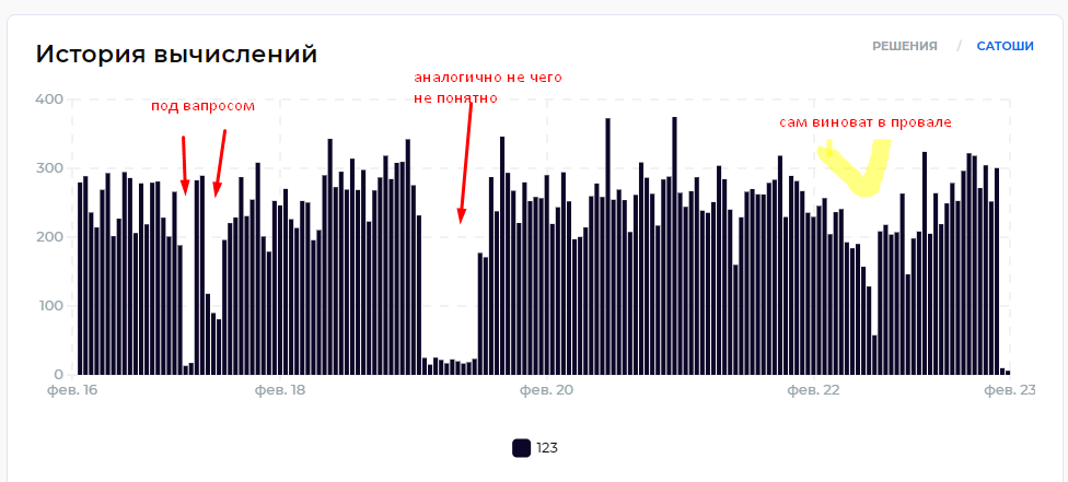 Вроде сатоши появились, но решения не соответствую действительности. Баланс не изменился, вот в чем проблема. Получается он должен был прибавиться, но стоит на месте. Или курс так сильно упал?