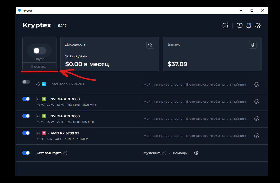 Я нажал на опцию “Ставить на паузу если пользователь не использует ПК”, но при перезапуске Kryptex ставит все майнеры на паузу. Один раз запустился и всё. Переустановка не помогает.