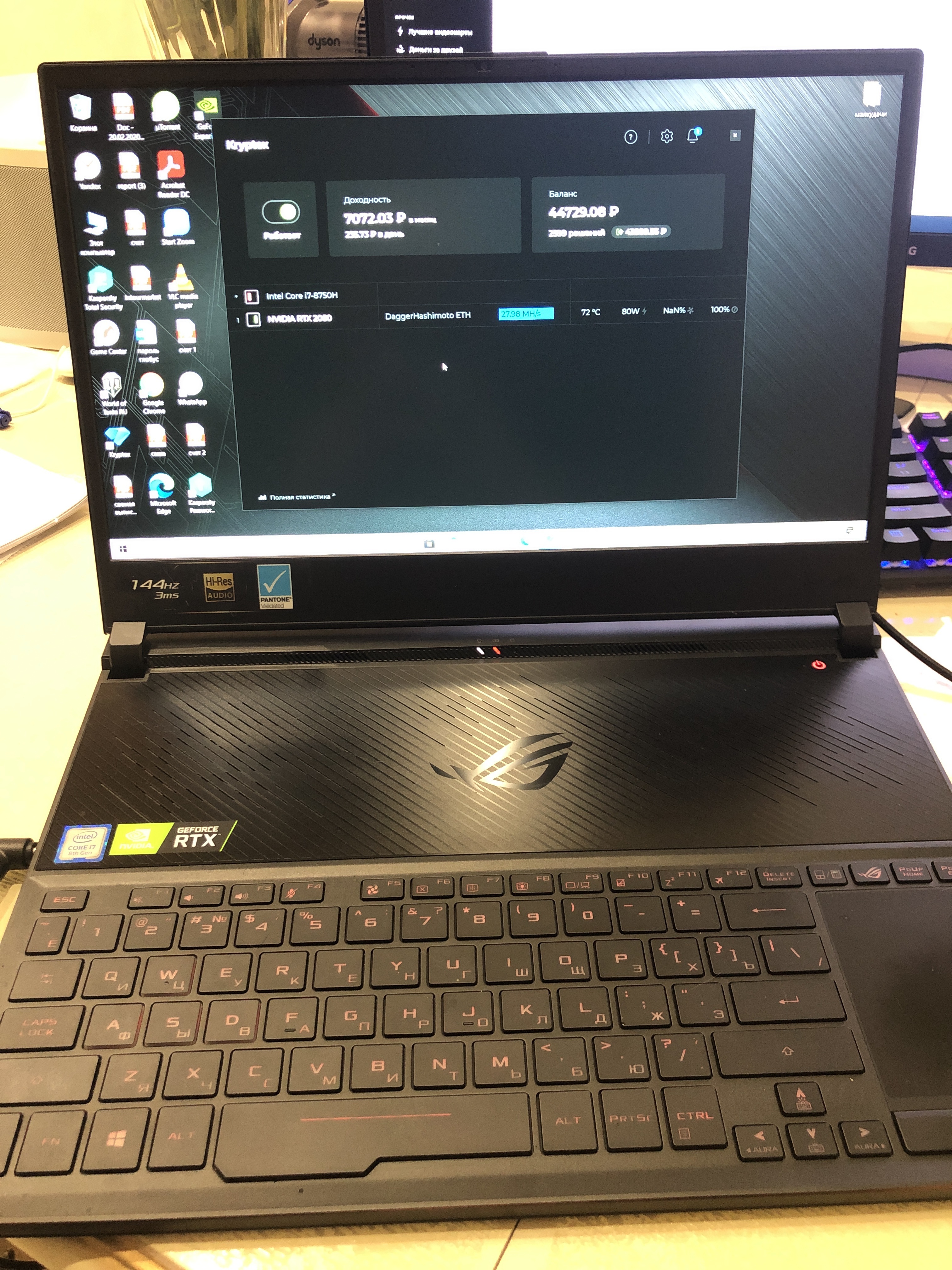 Проц не надо нагружать, тем более на ноуте. Жрет он много, майнит мало. 1500 хешей это 300 рублей в месяц примерно, оно надо? Обычно система охлаждения на ноутах единый контур на проц и видео. И греть на 100% оба чипа одновременно я считаю плохая идея.