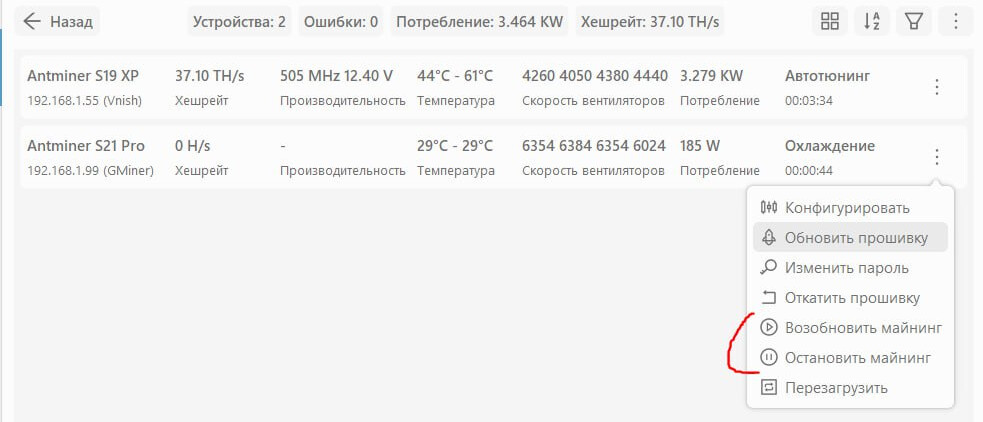 как вы себе представляете процесс отключения и сколько он должен занимать по времени - Да в принципе здесь достаточно просто остановить майнер, алгоритм управления вентилями сам отработает по температуре и сбросит обороты до минимума 600-700 об/мин, как правило это занимает 7-15 минут в зависимости от температуры окружающей среды
