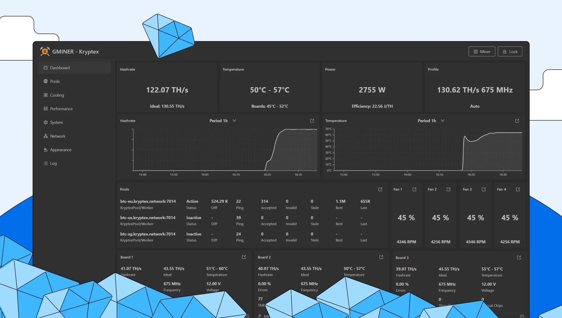 Сообщение о том что “устарел” можно игнорировать и следить за обновлениями на странице прошивок. Прошивка Kryptex × GMiner для ASIC | Kryptex . Прошивка передает user id как у майнера, и трекер версий user id думает что есть версия новее 3.44 как у версии майнера.