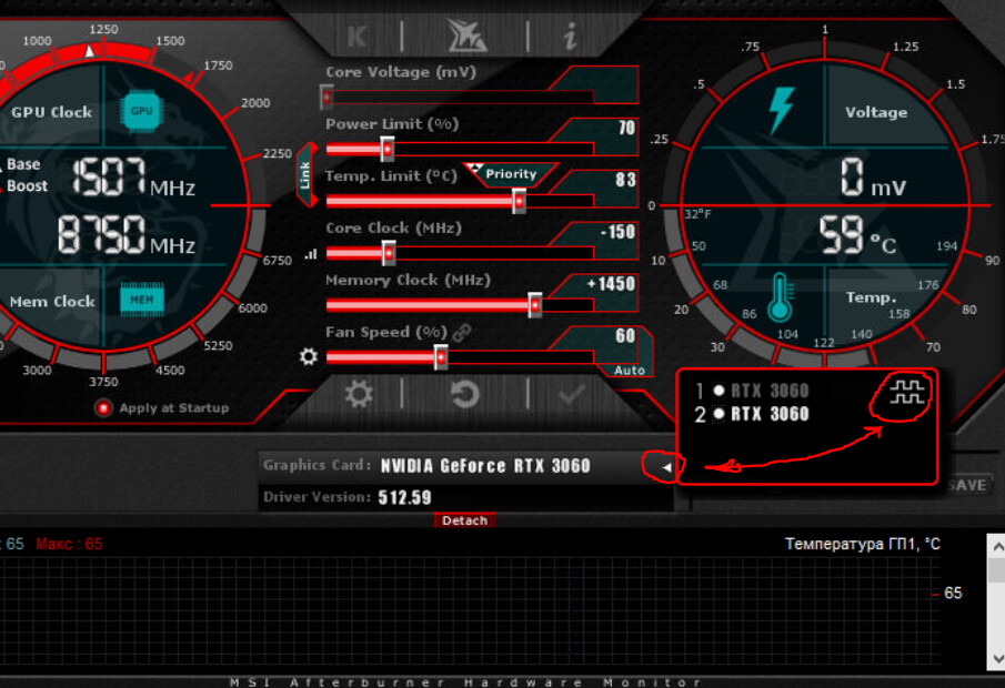 так я настраиваю разгон на одной карте и сразу автоматически на всех встаёт этот разгон