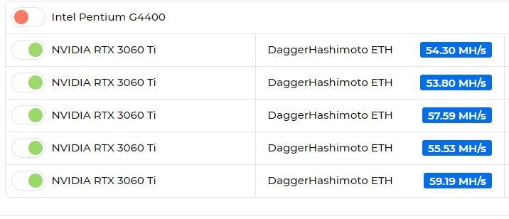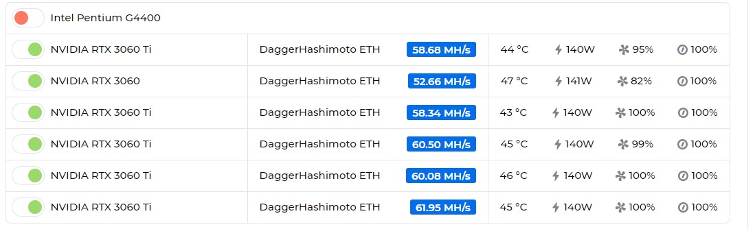 Подскажите пожалуйста если кто знает в чём может быть проблема с видеокартами 3060 четыре карты выдают 64-65MH/s а одна с теми же настройками выдаёт 44-47.00MH/s и больше не поднимается, почему она ровно со всеми не работает и как определить какая из пяти карт плохо работает