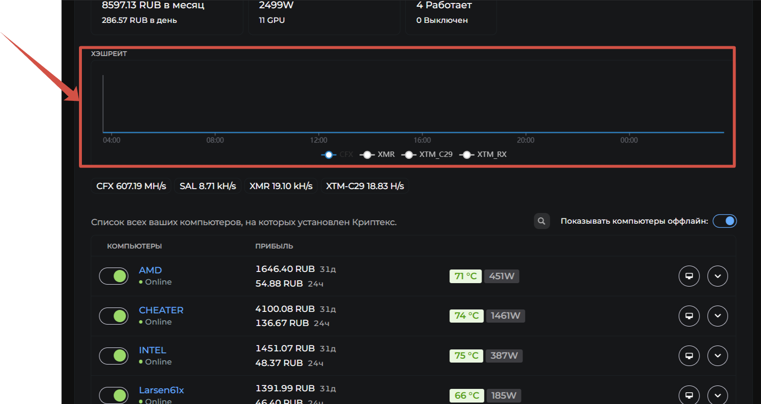 Графики, это вообще несусвктная чушь, по сравнению с цифрами, реальными цифрами. Лучше таблицу с цифрами вывели на экран по каждому алгоритму, за час/сутки/7дней/месяц. Ну что это такое нужно новодить курсором на столбец, чтобы посмотреть на всплывающую цифру. Если вы считаете что это удобно. Возьмите и перенесите месячную статистику из веб-интерфейса в текстовый документ. Посмотрим сколько у вас займёт это времени. Зачем это делать? Настоящий майнер всегда увлечён цифрами. Я раньше делал принт скрины заработка….в итоге перешёл на Ексель и Блокнот. К примеру где данные среднего хешрейта по ригу не только за сутки, но и за тот период который работает риг. Может оно и есть у вас в графиках, но с этими данными невозможно работать. Где отклоненные шары? Возможно они у вас в графиках и есть, но я ими не пользуюсь, легче посмотреть интерфейс майнера, а там вообще всё есть в таком случае. По итогу каша. Надеюсь на таблицу и голосую за неё. Кто тоже ставьте лайк.