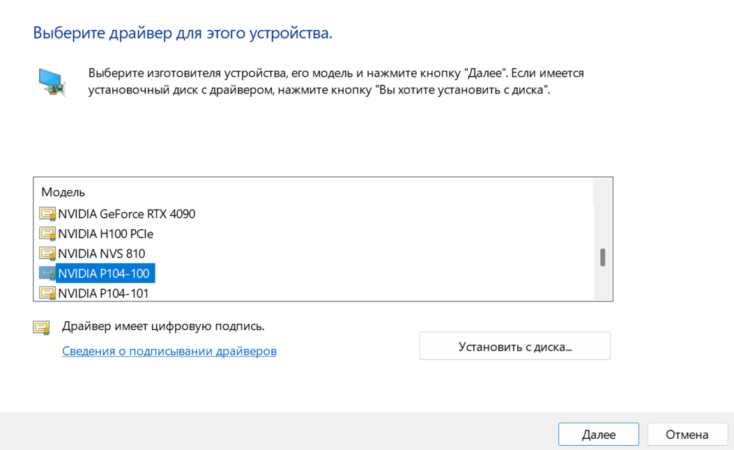 Ну а потом, ручками, через диспетчер, Обновить драйвер – Найти драйверы на этом ПК вручную – Выбрать драйвер из списка… – Установить с диска – открыть папку вплоть до Display.Driver, там выбрать любой .inf например nv_dispig.inf, в списке найти карту P104-100 – Далее – дождаться установки – повторить для каждой карты.