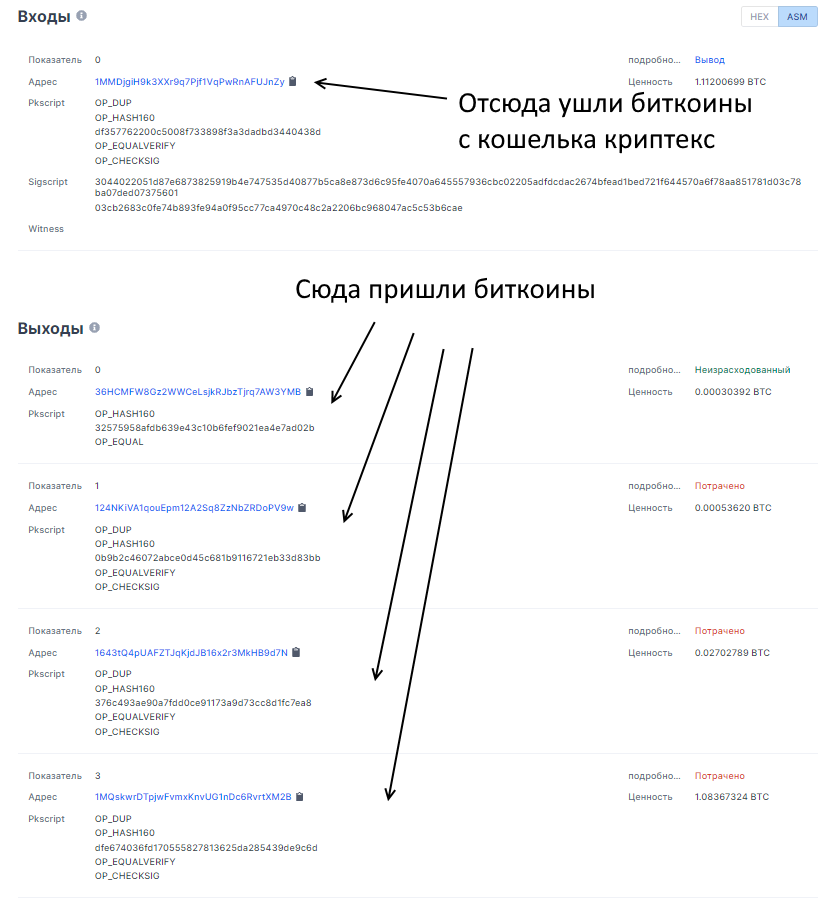 Если указать в криптексе биткоин адрес, средства придут именно на него, ни на какие другие 4 адреса, даже если все они принадлежат одному человеку под одной учеткой.