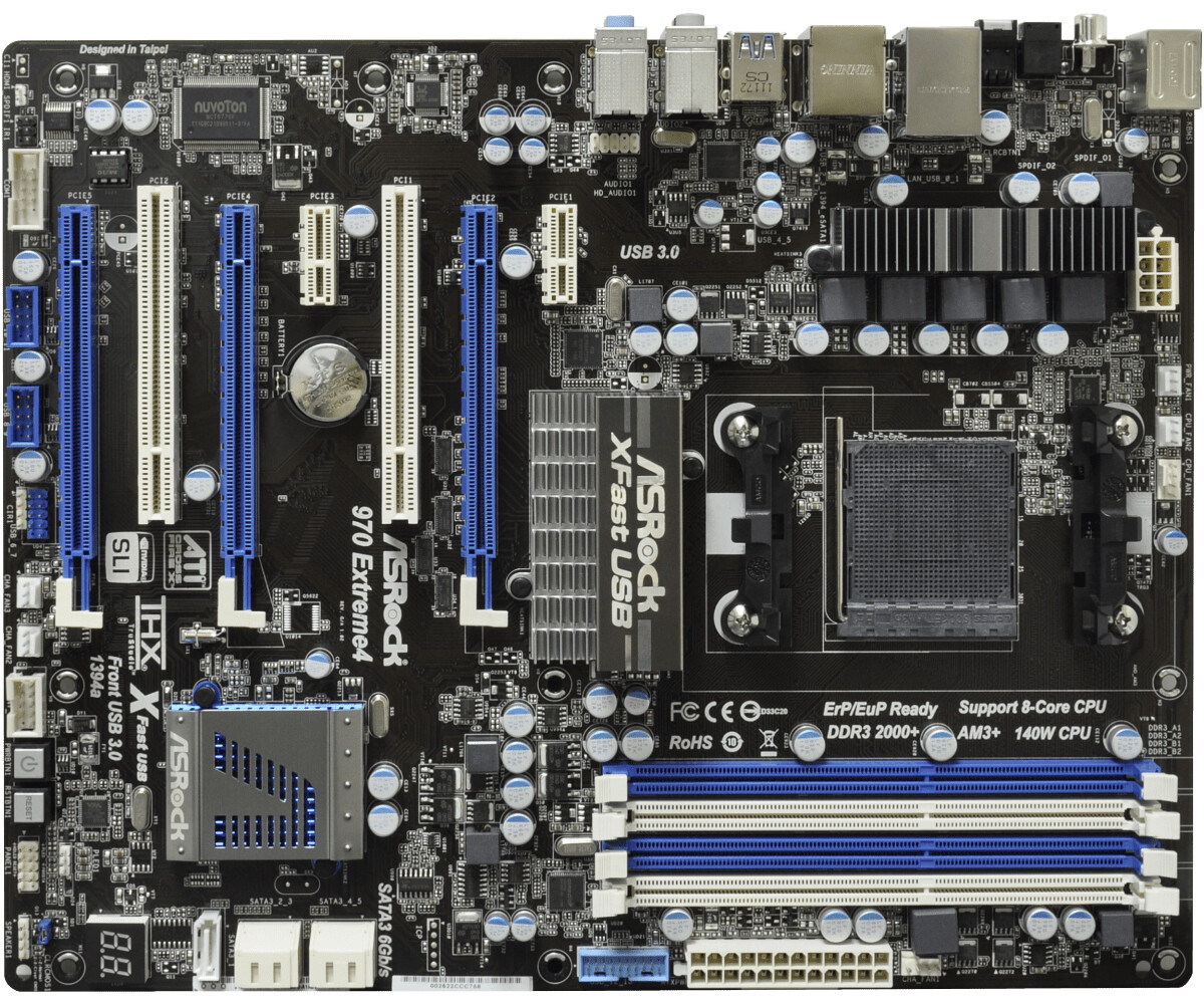 AGP здесь и не пахнет) здесь PCI-E x16 верхний, чуть ниже x8 и ниже x4 или x2 в зависимости от установленных видеокарт. Если не ошибаюсь это геймерская ASRock > 970 Extreme4 с поддержкой AM3+ а, белый это простой PCI обычно сюда звуковую карту присоединяют.