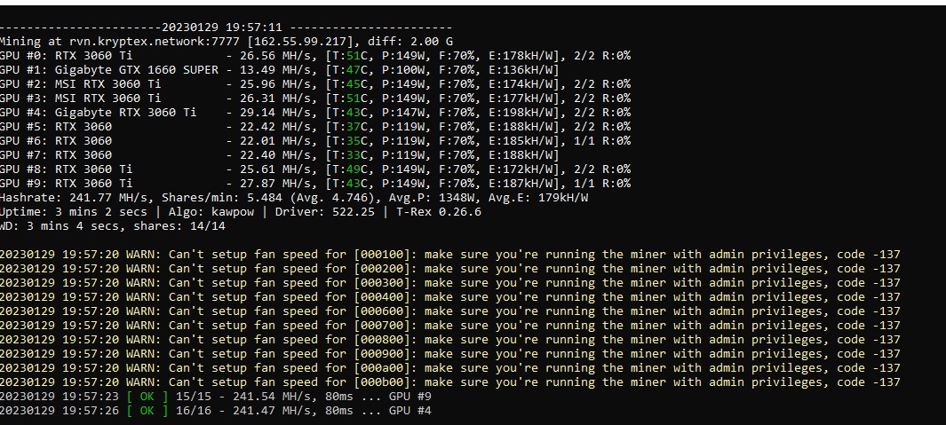 Привет всем почемуто не могу запустить батник на T-Rex ставлю вот эти настройки может где ошибку делаю помогите разобраться “t-rex.exe -a kawpow -o stratum+tcp://rvn.kryptex.network:7000 -u хххххххх@mail.ru.ВОРКЕР4” --cclock 0 --mclock 300 --pl 73 --fan 80