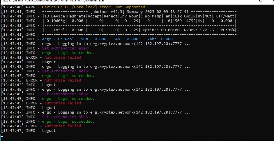 Там явно ошибка, по крайней мере с разгоном - вижу что майнер ругается на разгон.