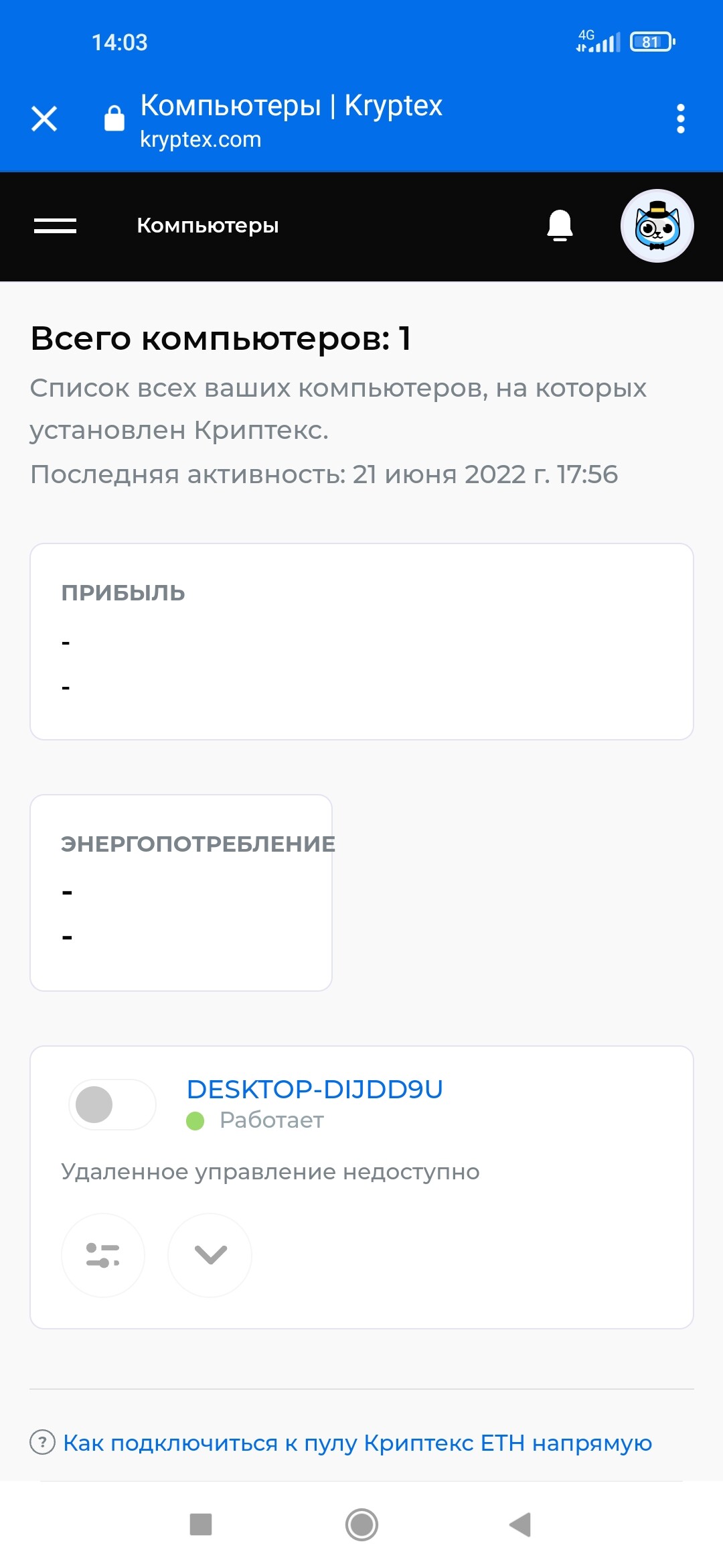 Онлайн-мониторинг и удаленное управление - это высоконагруженная система, сбалансированная между несколькими серверами Kryptex. Иногда один сервер может быть перегружен, и в этом случае компьютер будет переключен на другой сервер с большим количеством ресурсов. Это может привести к периоду, в течение которого ваша ПК будет недоступен для получения статистики и контроля в реальном времени.