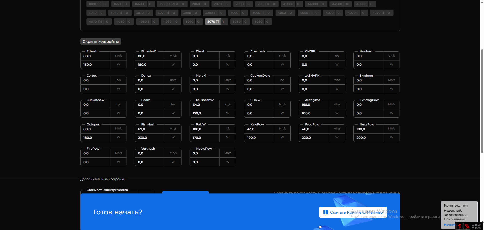 В пятой версии бенчмарк не обязательный, после установки карта сразу начинает майнить. Предсказания берутся с сервера, но могут быть не на 100% точными.