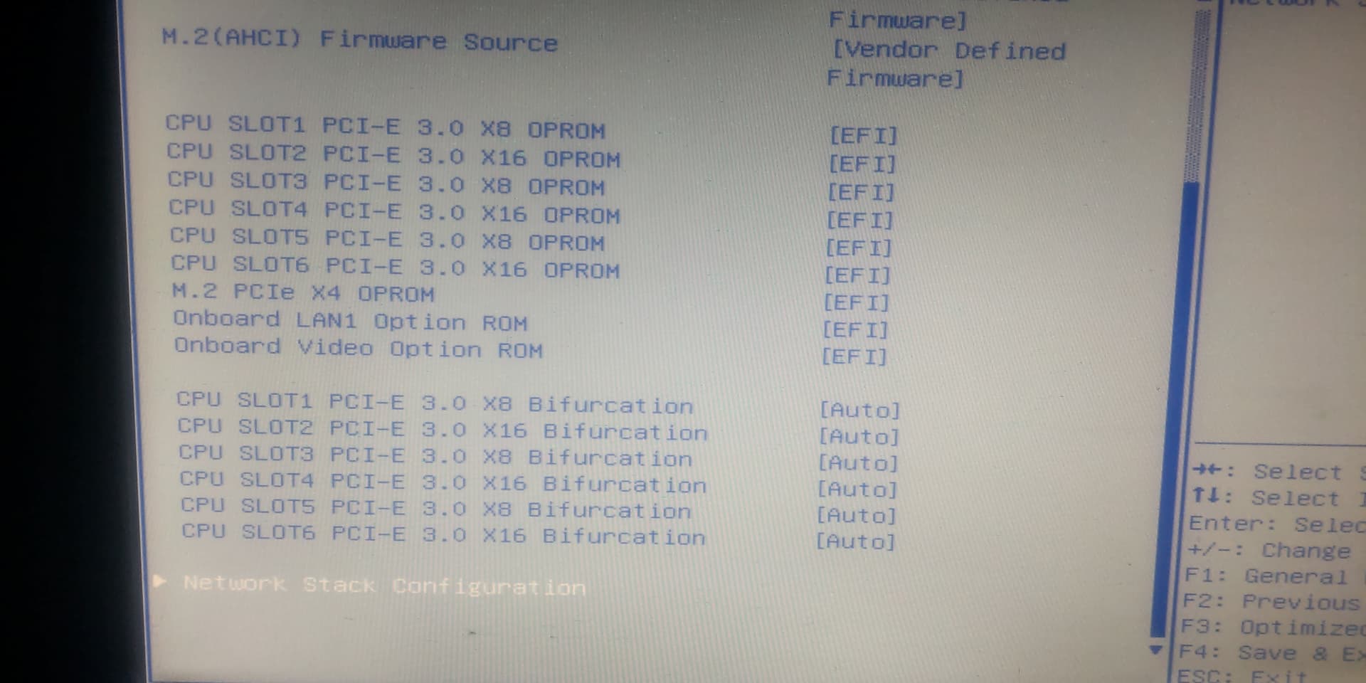 Всем привет! Обновил систему до следующей конфигурации: Мат.плата Supermicro H11SSL-i, процессор AMD Epyc 7532, 32 гига оперативки. Такая проблема нарисовалась: встроенная ASPEED 2500 работает, если поставить одну дискретку (RTX3070) - всё работает (вывод изображения как через встройку, так и через дискретку), но если подключить остальные 5 видеокарт через этот https://jabbamarket.ru/product/razvetvitel-1x-pcie-to-4sht-1x-pcie-splitter/?srsltid=AfmBOop9I7QYmmD3xMf-3sXQB1eBf-l1AQsNLoCBAyDCzY0eUjwkzw1q разветвитель - система не загружается, пост-код 60 и всё зависло намертво. Как быть, куда копать в настройках биоса? Помогите пожалуйста! Таких разветвителей 2 штуки, в один поставлены 3 карты, в другой - 2 карты.