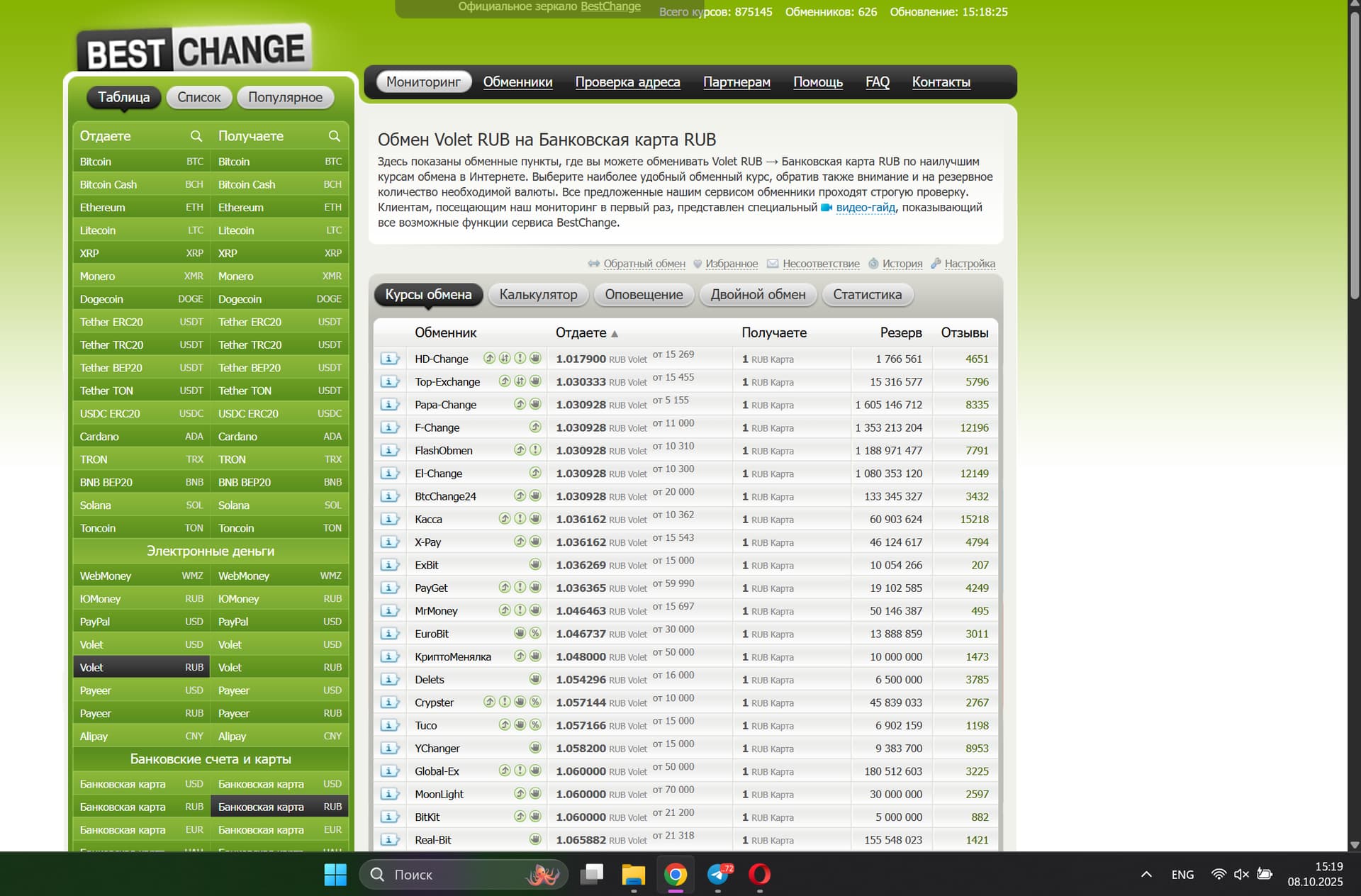 Bestchange норм открывается, но не предлагает обменников напрямую на ру-карту, вместо этого процитированная выше плашка в скобках
