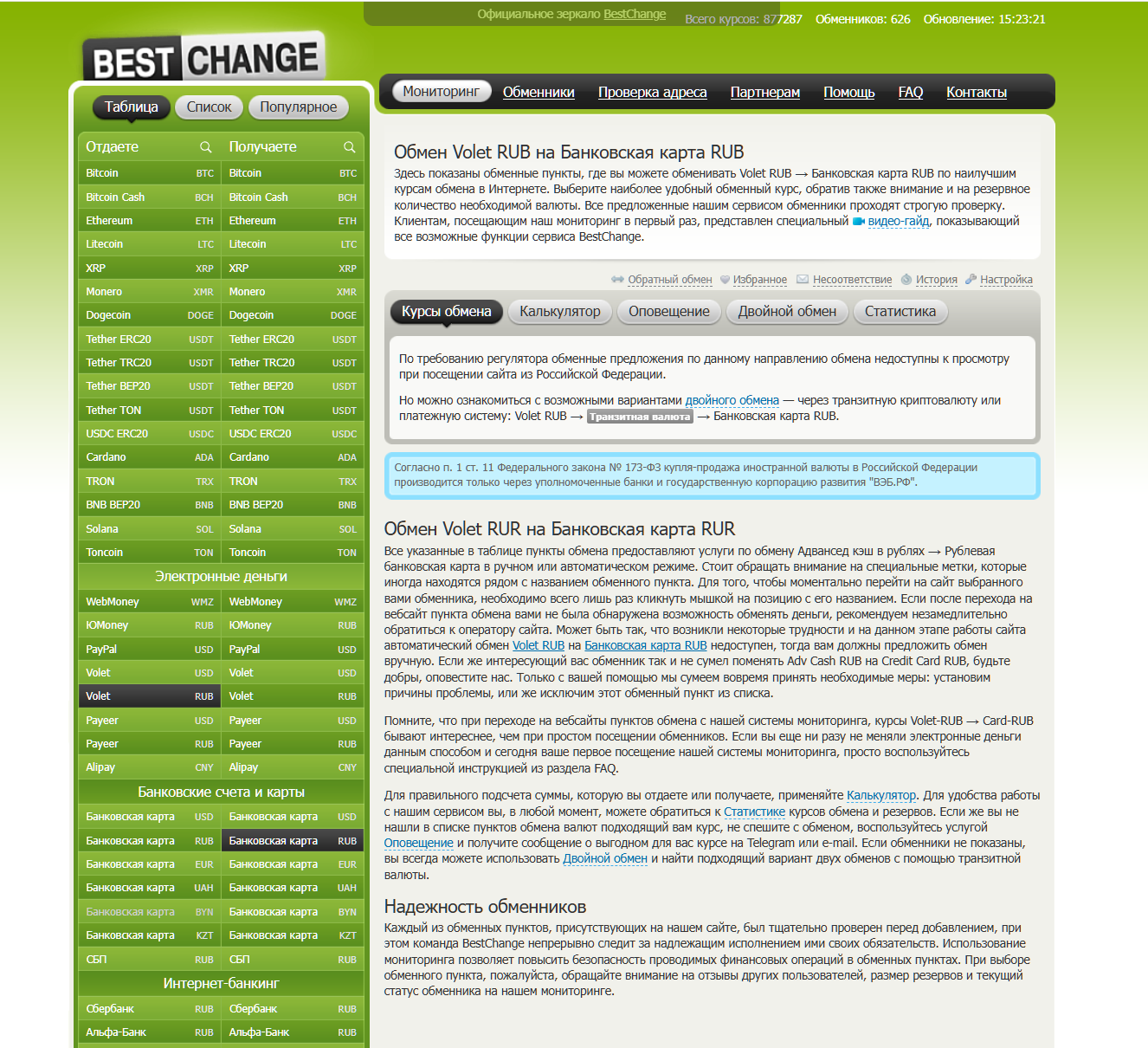 Вобщем я так понимаю Volet на ру карты всё, bestchange тоже всё (“По требованию регулятора обменные предложения по данному направлению обмена недоступны к просмотру при посещении сайта из Российской Федерации.”). Что на текущий момент еще нормально работает для вывода на ру-карту? Ну и чтобы не заблочили счета “по подозрению”