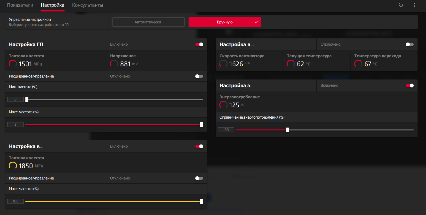 Дружище я не там, не там этого никогда не делал…не шарю в андервольтинге и разгонах…мне бы инструкцию по моей карте, как настроить её для майнинга в драйвере от АМД, и я был бы рад…а то электричества много пишет и греется до 76 градусов…тут ещё и мегахэш упал с 30 до 25. (( Я попробовал по одному ролику с ютюба настроить, настроил, запустил криптекс, работает 10 - 15 минут потом происходит перезапуск майнинга типо рестарта…я так понимаю значит что то не так пошло либо частота не верная либо миливольты не те…или как их там.