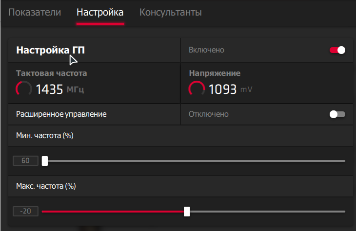 - Занизил тактовую частоту ГП, напряжение пробовал править, но сейчас работает на автомате.